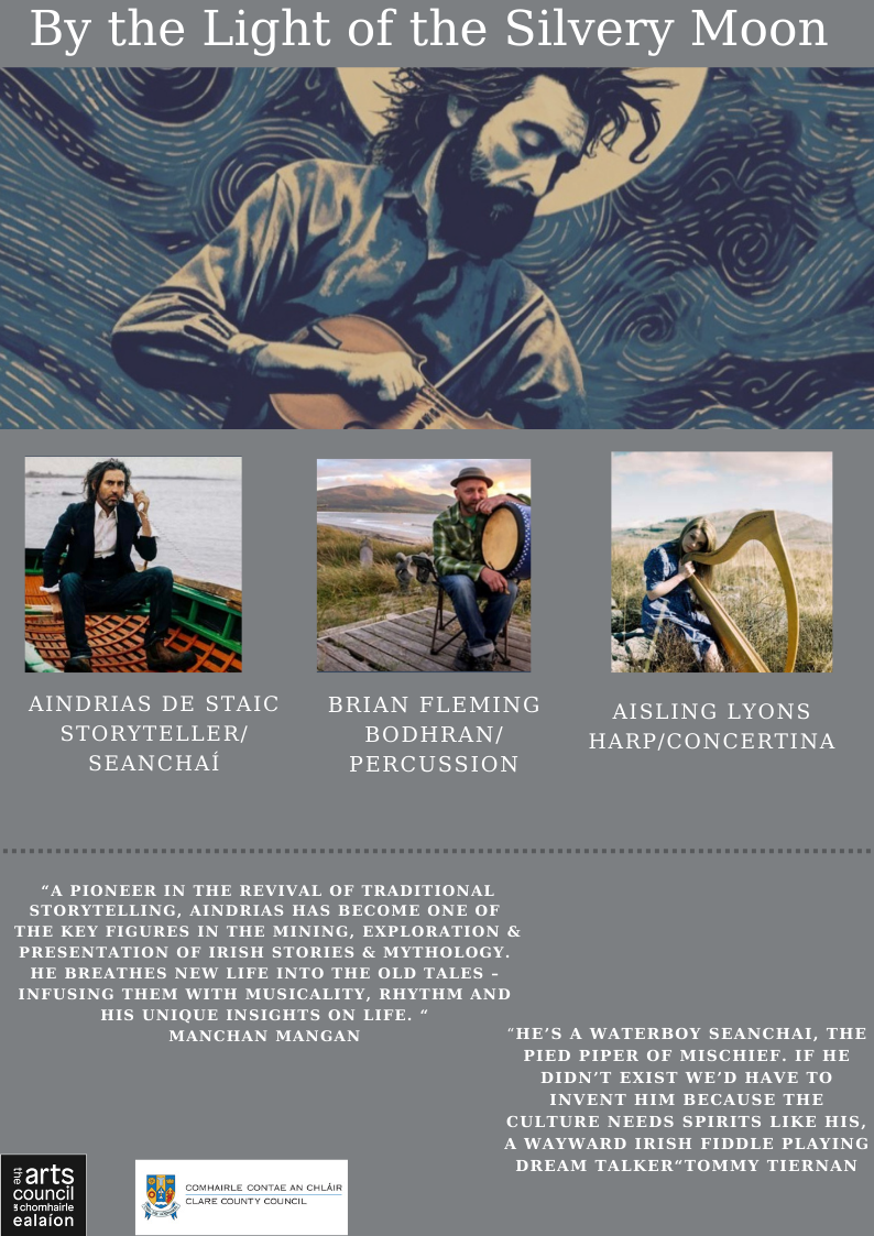 Following sold-out shows and nationwide acclaim, master storyteller and musician Aindrias de Staic brings his celebrated storytelling show By the Light of the Silvery Moon to The Courthouse Arts Centre on Friday 16 October, joined by his exceptional Bardic Troupe featuring Brian Fleming and Aisling Lyons.