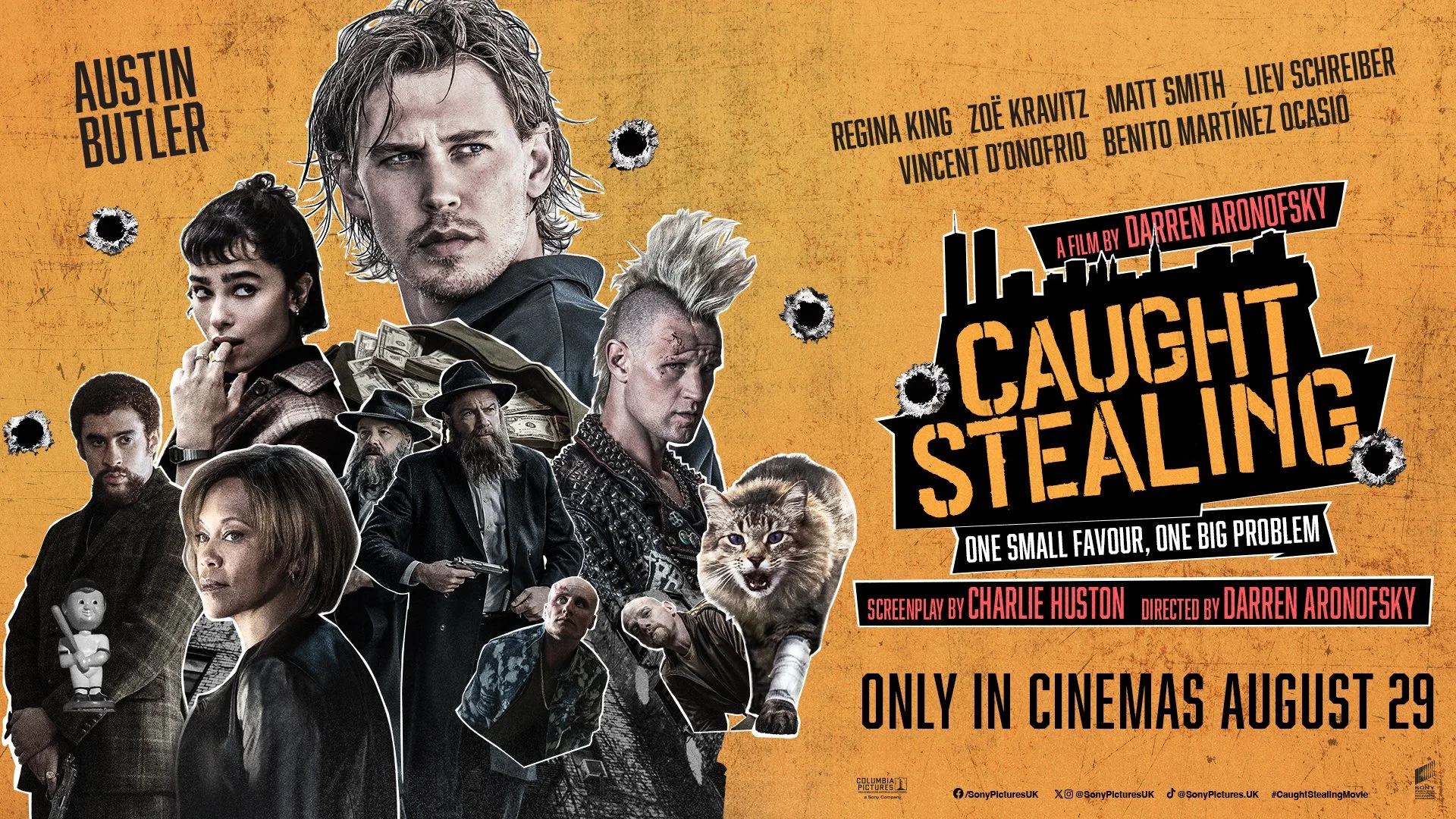 Caught Stealing is directed by Academy Award® nominee Darren Aronofsky, screenplay by Charlie Huston, based on his book of the same name. The film stars Austin Butler, Regina King, Zoë Kravitz, Matt Smith, Liev Schreiber, Vincent D’Onofrio, Griffin Dunne, Benito A Martínez Ocasio, and Carol Kane.